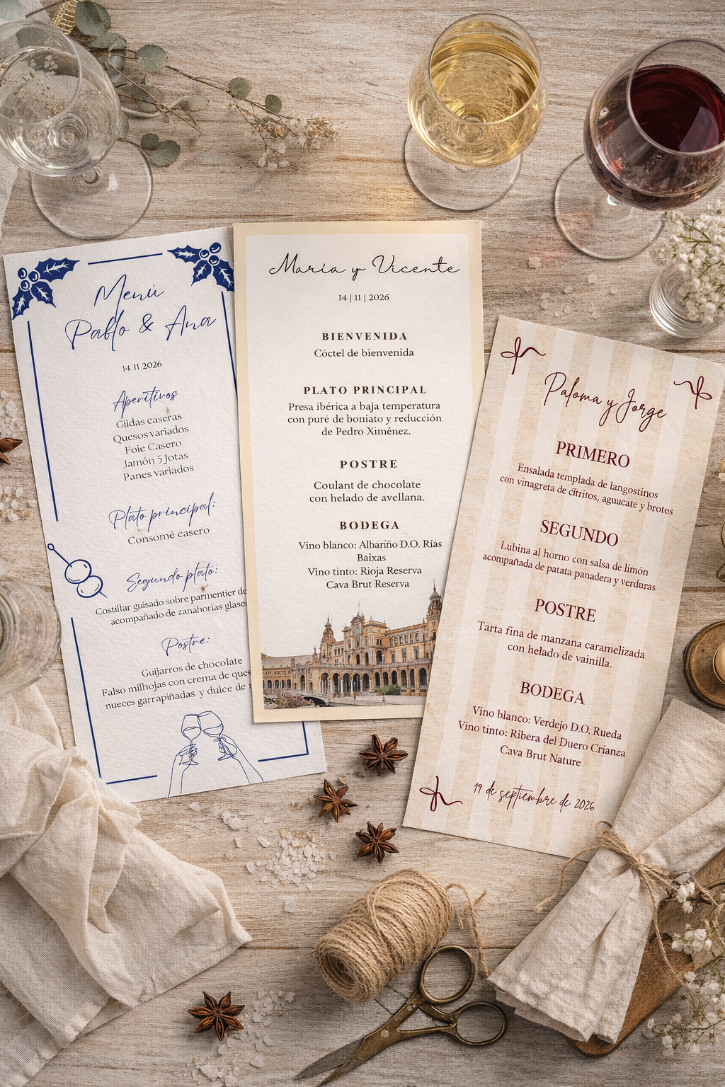 Cada minuta está diseñada para integrarse con la decoración de vuestra mesa y reflejar el estilo de vuestro gran día.